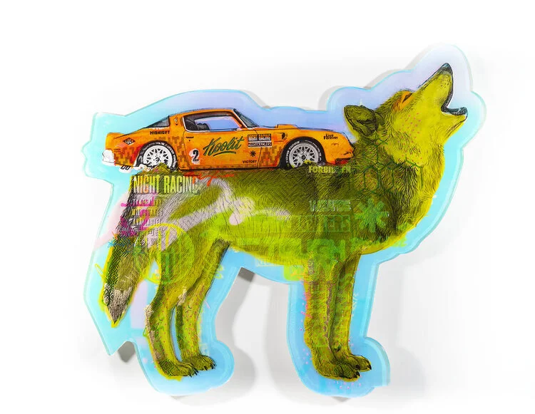 Electric Coffin’s works contain deeper meaning and intention without ever becoming too precious about it, in fact the work obviously belies a great levity that foments an easy accessibility to the viewer. A piece can be appreciated for its underlying motivation OR just the fact it’s a bad ass looking neon ringed wolf howling into the void with a Trans Am lashed to its back. However even such a cartoonish image has its own subtext, and animals, specifically the Wolf and the Bear feature prominently in this show as reoccurring “characters”. Electric Coffin’s iconic imagery of wild animals tied to technology (cars, trucks, space shuttles usually on the backs of panthers, wolves, raccoons) has been a staple in their oeuvre, a surreal and funny image that upon reflection shows some various obvious and disconcerting truths about man’s endless quest for technological dominance to the detriment of the natural world. For example, the Wolf and Bear in (as seen dominantly in the “Suburbs of Eden” show) are anthropomorphic archetypes that EC return to multiple times. The Bear represents the idea of exploration, and can refer to everything from external exploration (such as space travel) to internal mystical contemplation. The Wolf is a symbol of freedom, as in the trope of The Lone Wolf and is often juxtaposed with eastern images (such as a temple to reflect the concept of Nirvana) to western (equivocating fast cars with a sense of rugged individual freedom).