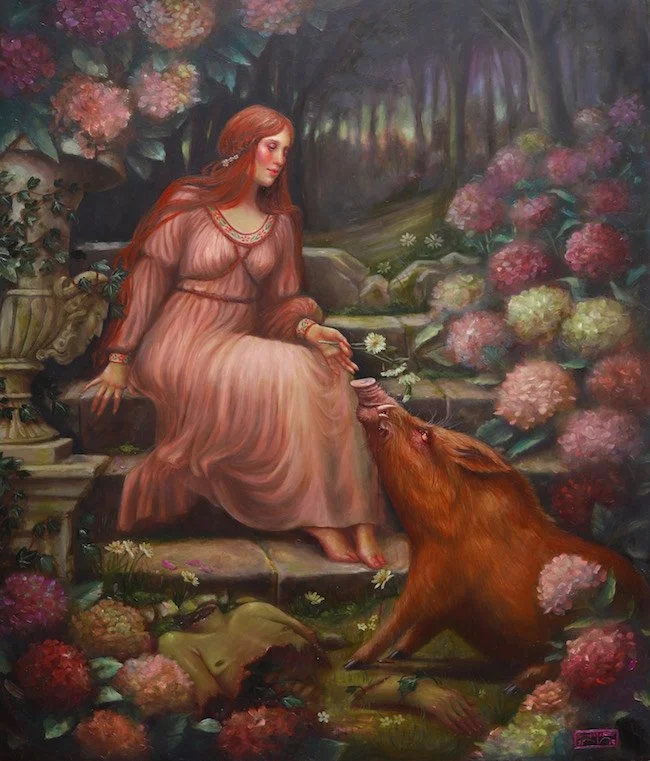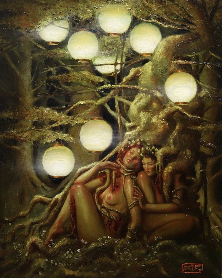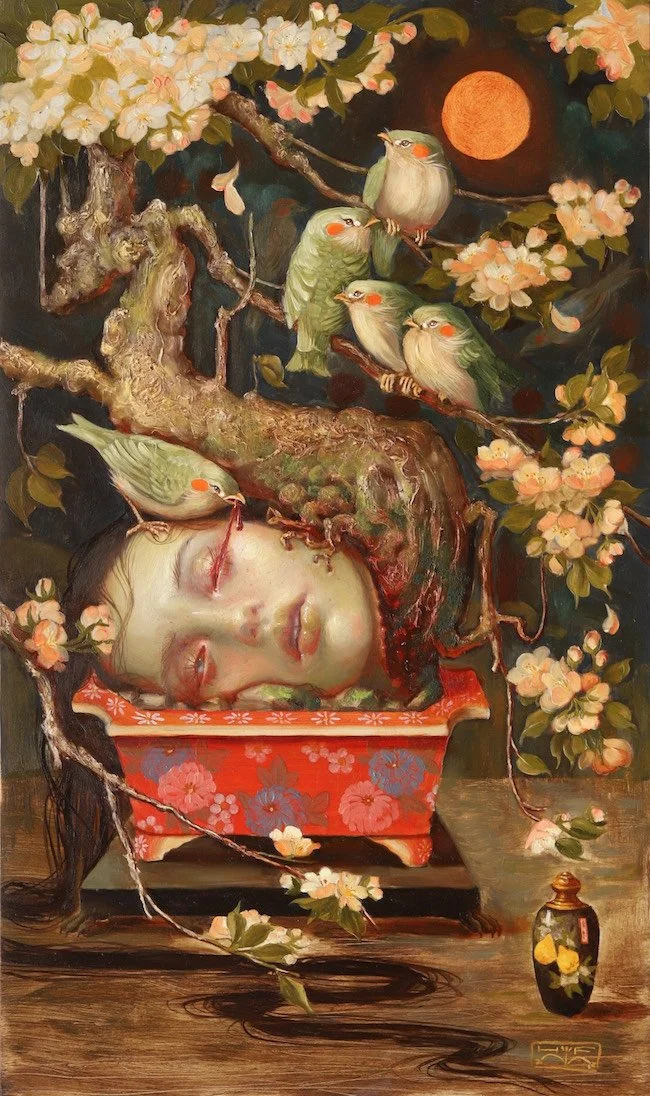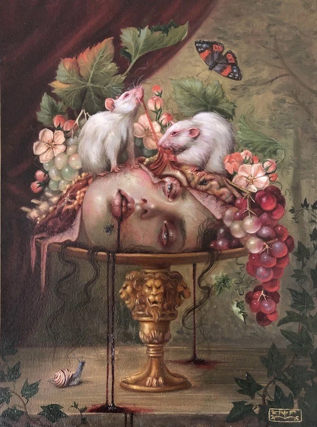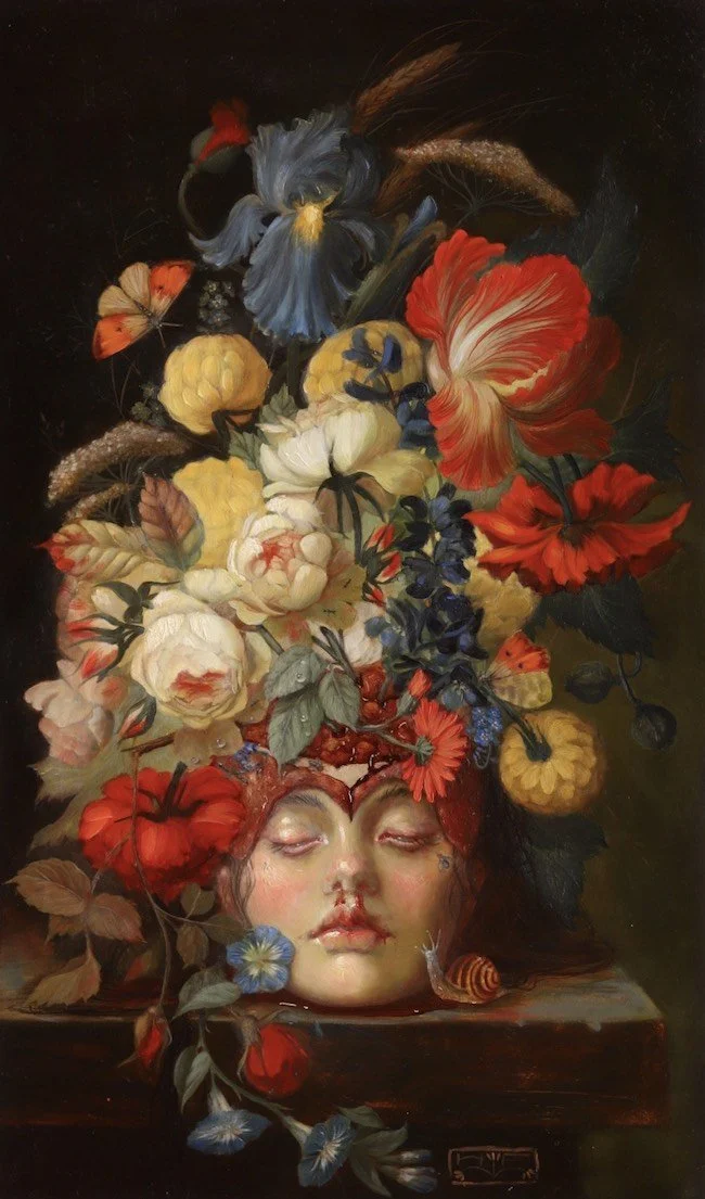 Roq La Rue is pleased to present Hannah Flowers first full solo show. Born in Tasmania but currently based in Scotland, Flowers paintings depict a dark wonderland of mythic symbolism and allegorical grotesques. These often harken back to original European fairytales that were much grimmer and dark than the sanitized versions we have today. Flowers work also references the 19th century Demi-Monde's appreciation of nighttime opulences, carnal infatuations, and dalliances with La Fee Verte. This combined with her lush florals and maiden images create a sort of Macabre Nouveau aesthetic.
