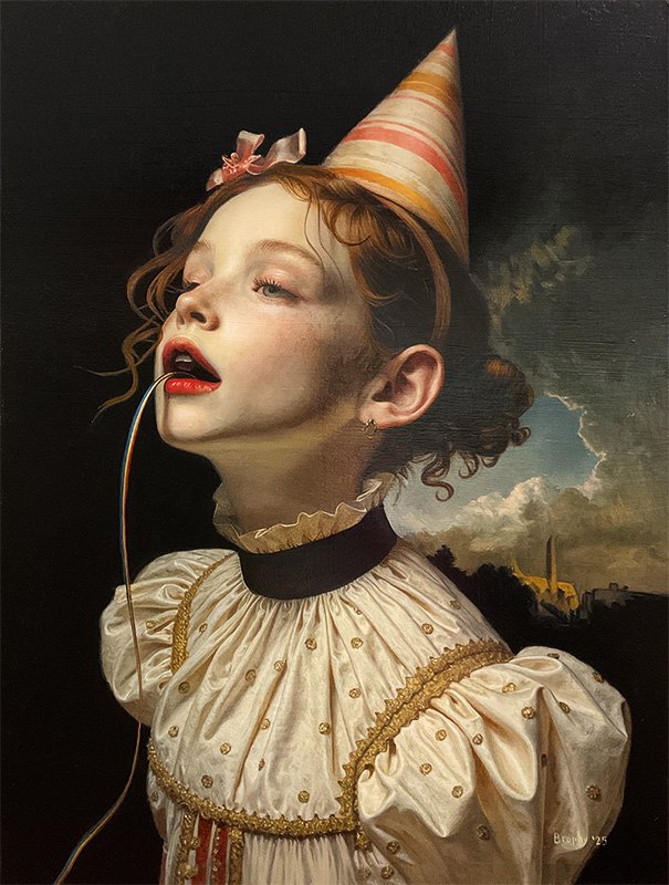 We are thrilled to present a small solo by Dublin based and longtime gallery exhibiting artist John Brophy. Brophy's unusual painting style is due to his highly labor intensive creation process. Each work is first digitally rendered in a 3d modeling program by Brophy- with every detail added, arranged and lit inside the program. Once Brophy is satisfied with the image, he then uses that as a guide to completely recreate the image by hand in oil paint on panel, often making his own oil paints and finishes from scratch. His strict adherence to recreating the digital image creates a strange discordance- a sense of "uncanny valley"- we obviously know the "characters" portrayed but cause us to question what we really know about them, what is real and what is projected by the viewer.