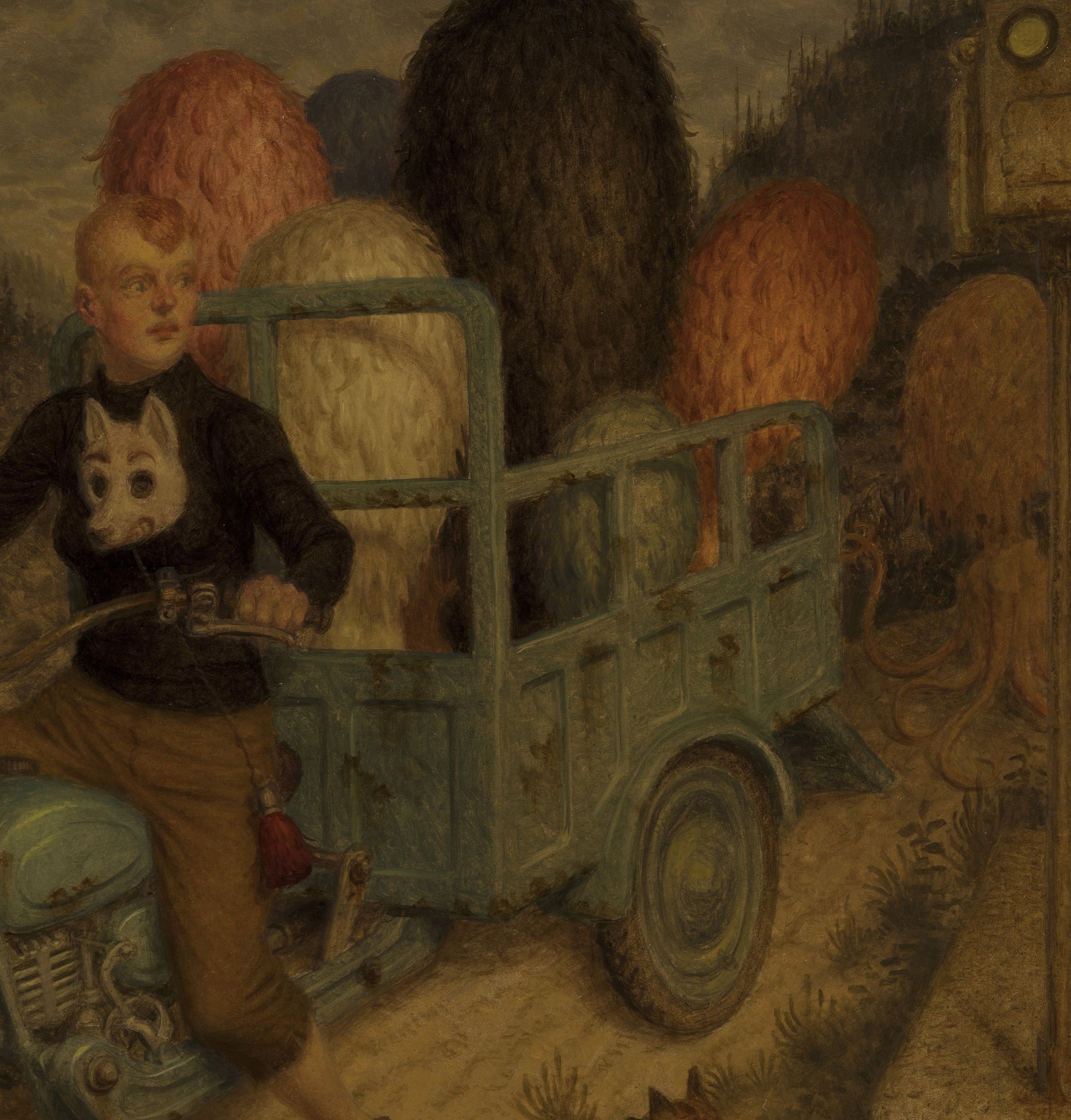 Peter Ferguson (Montreal, Canada) returns for his yearly December show with a new batch of works for his solo show "Aim For The Control Device, Julie". Peter has amassed a fanbase for his singular style- a distinctive blend of cosmic horror and good natured absurdist humor, influenced by everything from 50's pulp magazines, 1940's National Geographic stories, to Jules Verne-worthy steampunkish technology and Golden Age of Exploration fantasy. His work is always rendered in his signature dark palette purposefully created to evoke paintings found in old posh gentlemen's clubs or decaying estates. Only upon closer inspection does the surrealistic bent appear.