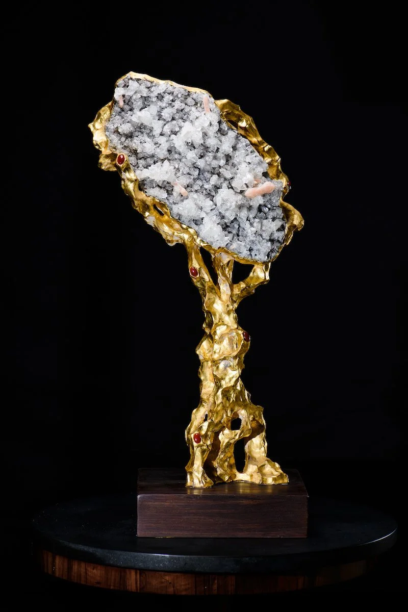"My art is inspired by the mystique of religious, ceremonial and cultural relics, and explores hidden symbols and age-old traditions. I use materials such as wood, plaster, gemstones, mineral specimens and gilding to create sculptures that are meant to evoke awe and reverence. My work delves into themes of ritual, social inequality and climate change, translating these abstract ideas into tangible forms that invite contemplation. I work slowly, allowing each piece to evolve organically into a final form that blurs the lines between natural and sculpted elements. I aim to create pieces that are imbued with a sense of otherworldliness and intrigue, paying homage to the past while inviting the viewer to contemplate the present and future." - Rand Babcock