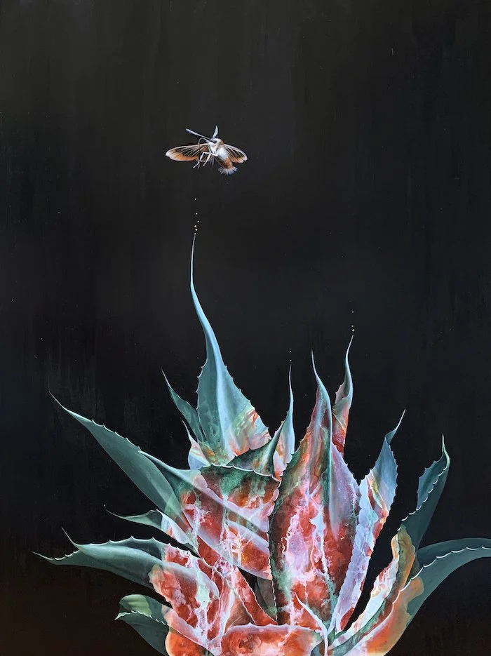 Josie Morway “Hummingbird Moth With Agave And Hints Of The Flames” oil on cradled panel 18” x 24” SOLD