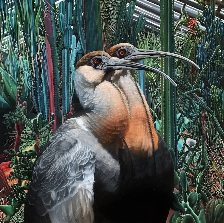 Josie Morway “Vigilant Ibises With Cactus Hothouse” oil on cradled panel 36” x 36” SOLD