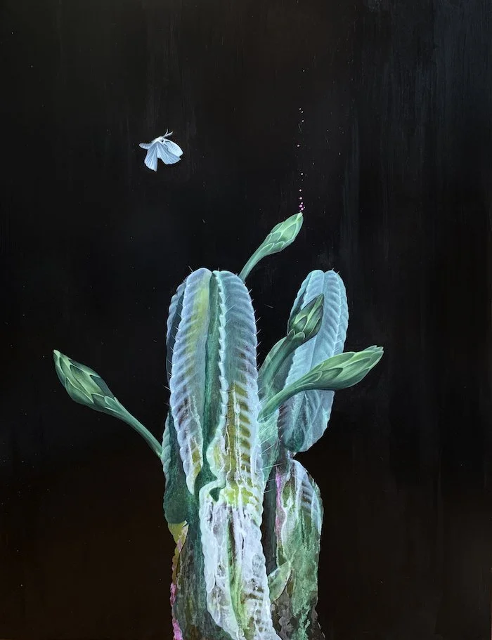 Josie Morway “White Moth With Cereus Hexagonus and Hints Of The Wind” oil on cradled panel 18” x 24” $2600.